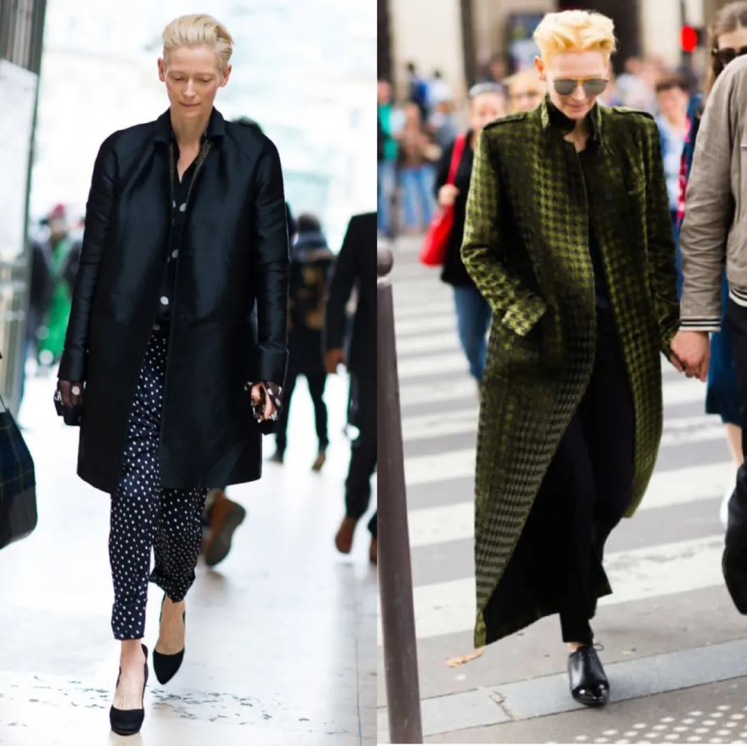 Tilda的私服风格倒还是非常统一的,尤其偏爱极简的中性风帅气穿搭,例如设计与剪裁独特的长款大衣与西服套装、“攻气”十足的西服外套搭配高跟鞋,帅气而又不失女人味。