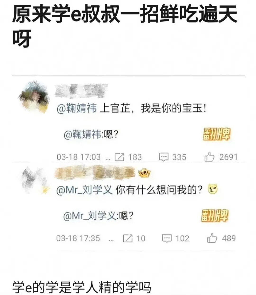 因为这两对cp都有刘学义,而且两次都是他比女方晚发,所以网友都在审判刘学义,说他一招鲜吃遍天,讽刺他名字里的学是学人精的学。