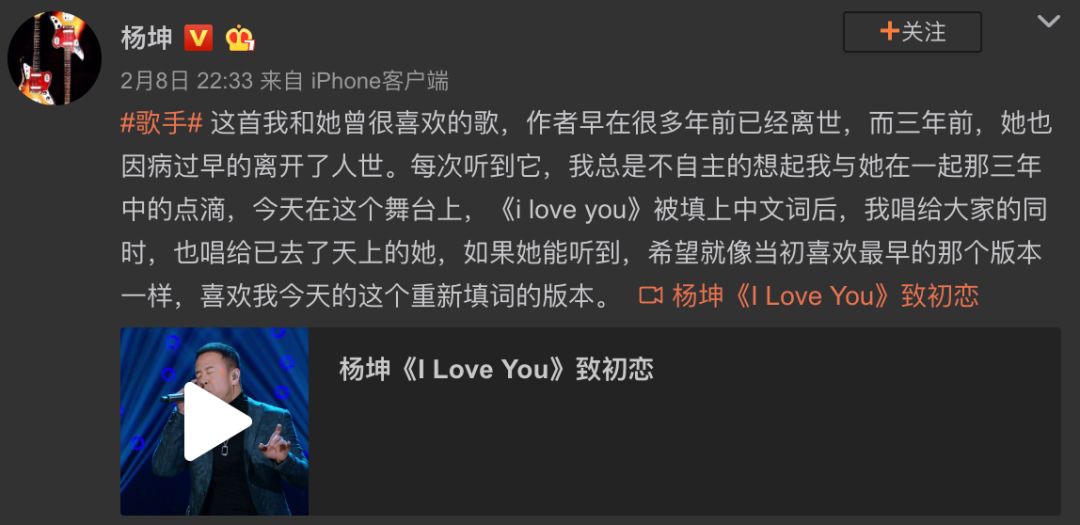 表演结束之后,杨坤还发了微博讲述自己的感受:“我唱给大家的同时,也唱给已去了天上的她,如果她能听到,希望就像当初喜欢最早的那个版本的我一样,喜欢我今天的这个重新填词的版本。”