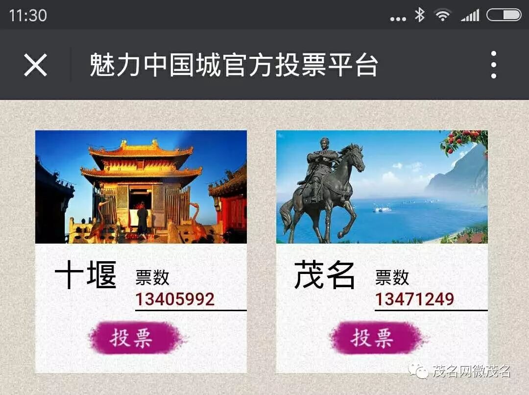 截至8月4日11时30分,魅力中国城官方投票平台中,茂名得到13471249票在32个城市中得票数排名第1。与茂名同阵PK的十堰得到13405992票。