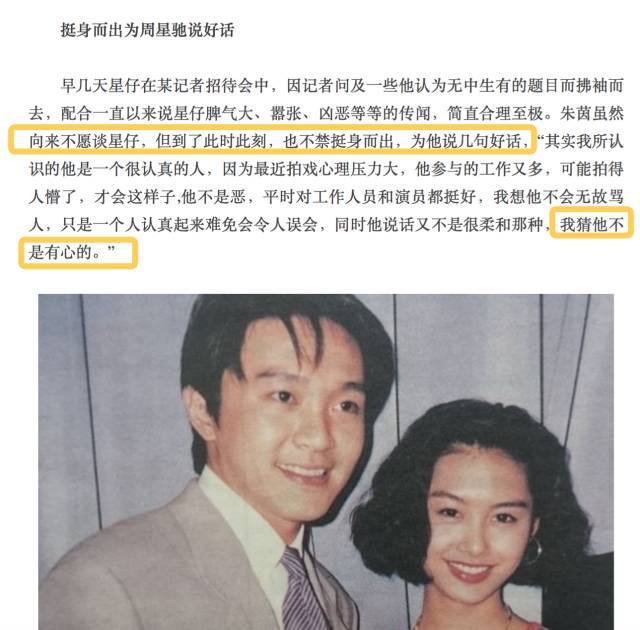 在不怎么被看好的情况下,1994年《明报周刊》的专访里,朱茵却完全是一副捍卫周星驰的姿态。