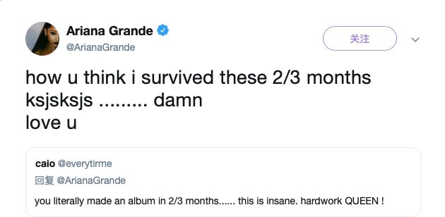 首先要说A妹真的太拼了!距离上一张、也是第四张专辑《Sweetener》发行还不到3个月,明年3月还有巡回演出。