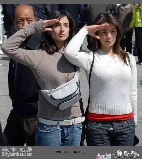 图为外国MM向中国军人敬礼!向五星红旗敬礼!