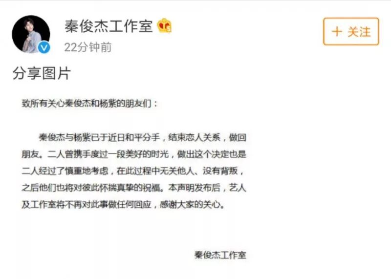 但刚刚,双方工作室正式宣布了两人的分手消息。让人本来对这段感情抱有一丝希望的,现在幻想彻底破灭。