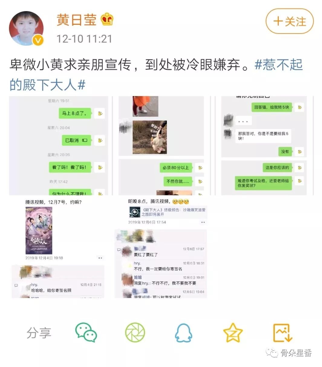 但其实黄日莹是个贼可爱的姑娘,微博上是碎碎念画风,自己的表情包用起来毫不手软。《惹不起的殿下大人》上线后,她化身“卑微小黄”,到处向自己的亲朋好友卖安利,也是十分接地气了。