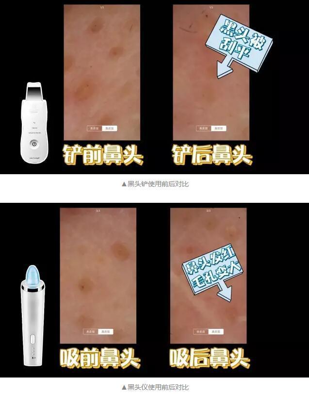 可以看到不管用黑头仪还是黑头铲,对付黑头都是比较有效的。但用黑头仪去吸的话,可以明显看到毛孔变大了,而用黑头铲刮过后的毛孔就比较平整~