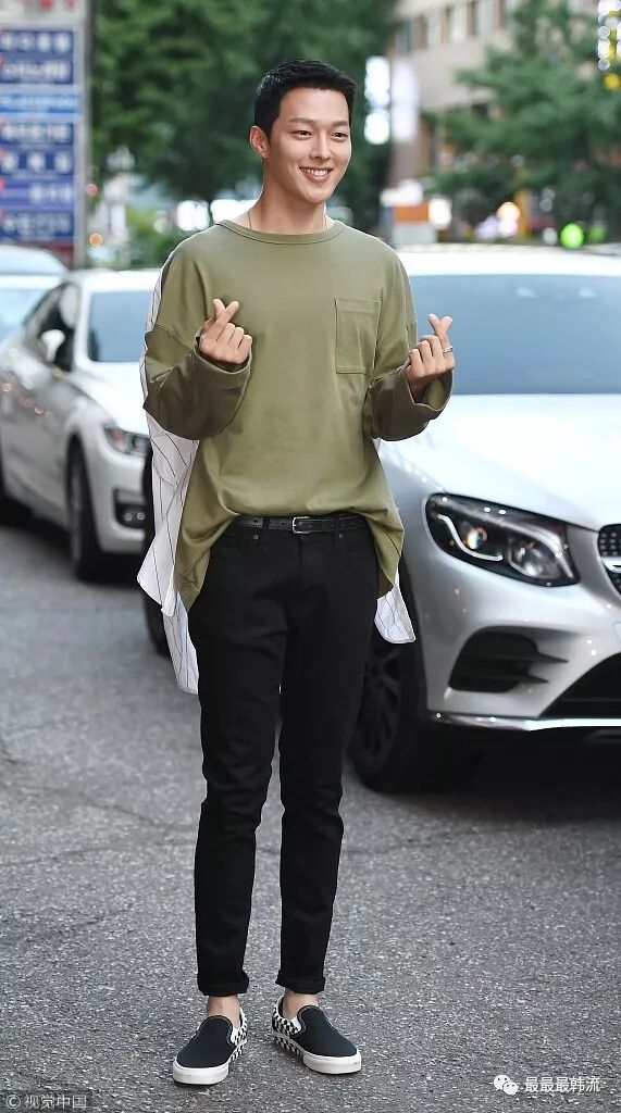 张基龙的造型个人觉得在夏天来说不太阳光,这个墨绿色上衣看着有点暗,闷闷的感觉,如果款式新颖一点应该会更好。