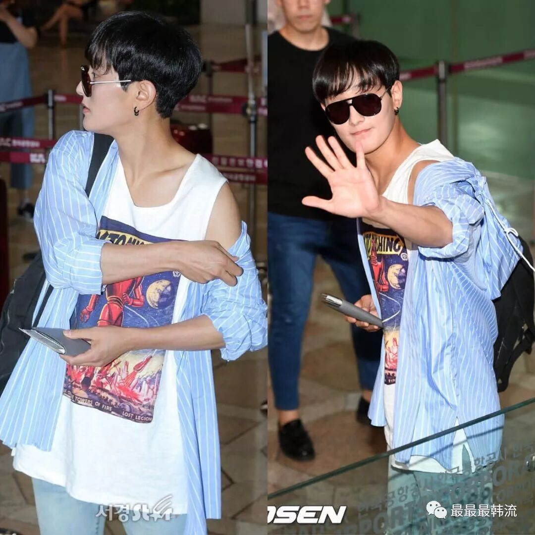 姜昇润的机场也是出了名的有风格啊,很swag的hiphop风。黑色长款无袖印花T搭配蓝色格子衫,都是蓝色系点缀。