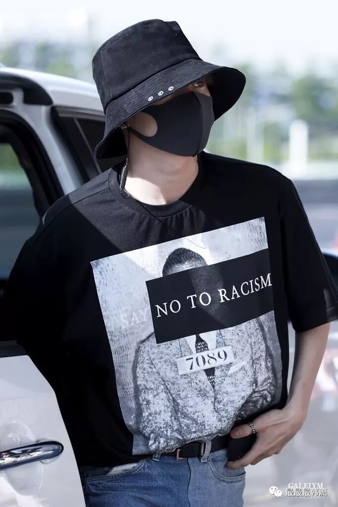泰民的这套机场搭配就很酷盖了,一般看遮住脸的绝对就是酷炫boy风。黑色印花T配牛仔裤,牛仔裤的款式微喇,看起来挺特别的。