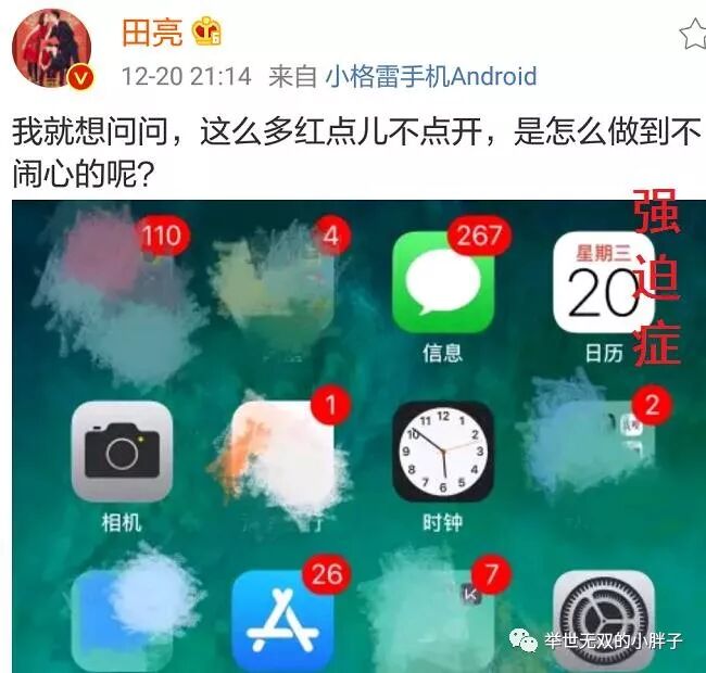 好爸爸田亮刚刚在微博发文疑似“吐槽”妻子叶一茜,前方来自处女座强迫症的牢骚:我就想问问,这么多红点儿不点开,是怎么做到不闹心的呢?