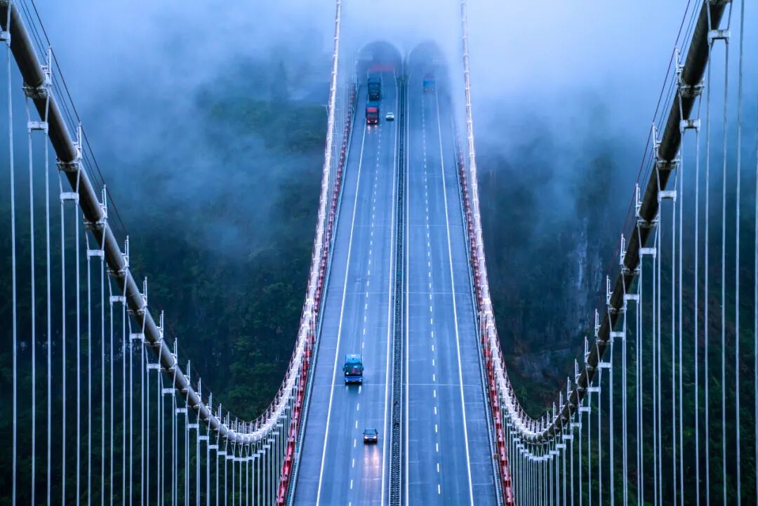 山间云雾缭绕时,矮寨大桥就像是架在云端的天梯,一眼望不见尽头......