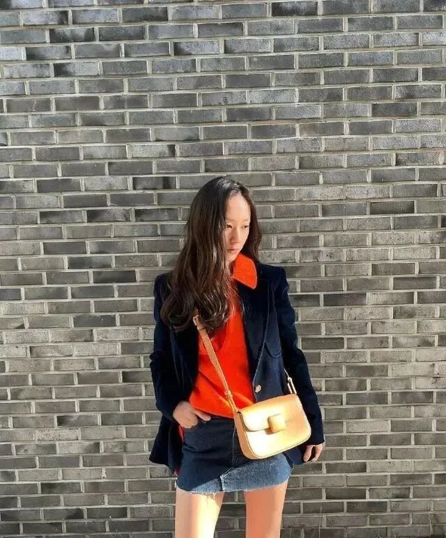 Krystal郑秀晶在西装里面搭配了橙色的衬衣,温暖又清新的橙色瞬间占据视觉,带来靓丽的摩登效果,衬衣与外套形成反差,展现女神范的同时又足够风采。