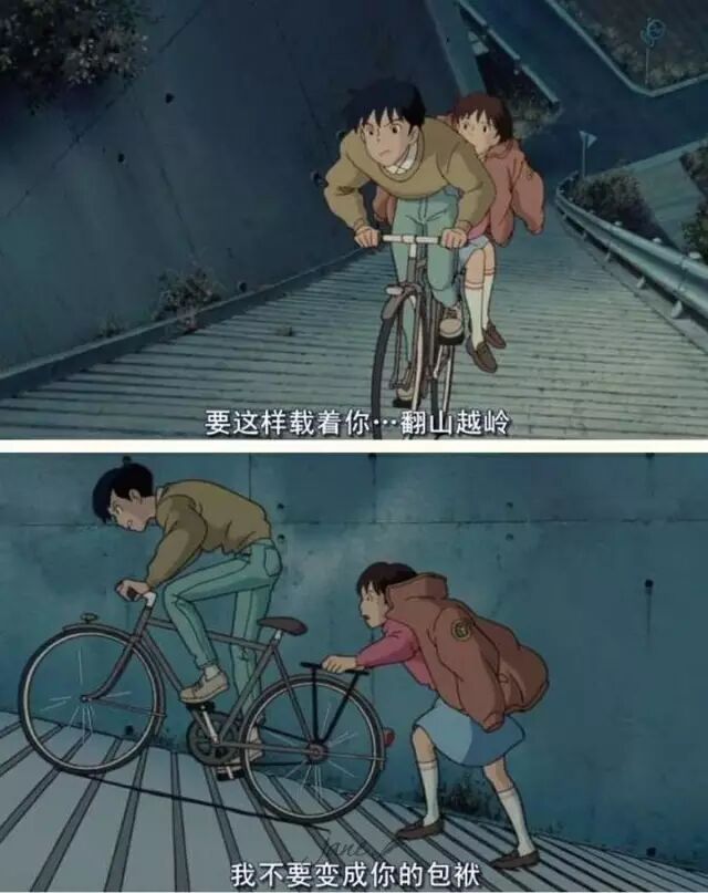 她还是跳下来了,她一边推着他骑一边坚定地说:“我不要成为你的包袱,我也早就想好了,要在背后支持你。”