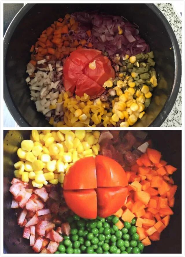 第二步:淘米放入电饭锅,然后加入各种粒、加适量的水,蒸熟即可