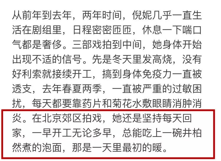 倪妮曾说自己在北京郊区拍戏,尽管很累,但还是坚持每天回家,因为不管第二天开工多早,总能吃上一碗井柏然煮的泡面。