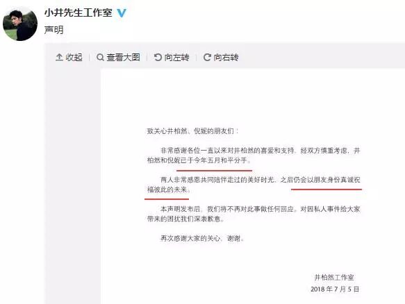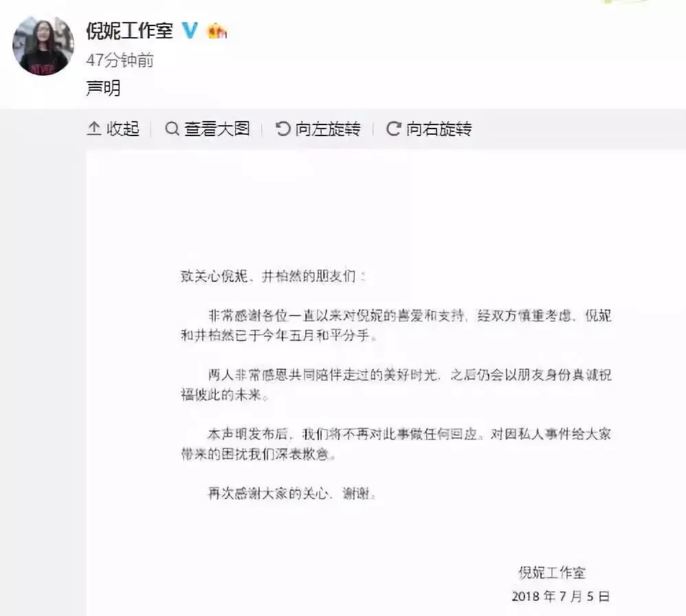 这段时间一直被传分手的井柏然倪妮,大上午,工作室就双双发声明,盖章两人早在五月就和平分手了。