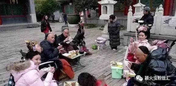 对比男神吴彦祖的饭,刘诗诗片场的饭可是丰盛太多了。然而相同之处还是要坐在地上吃,虽然条件差但大家的表情都是幸福满满的。