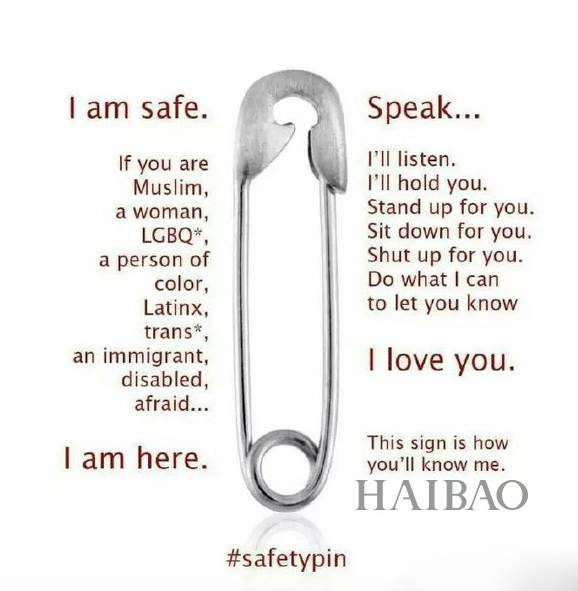 于是她在网上发起了“安全别针”的活动,称只要带上别针即代表“我是安全的,你可以坐在我旁边,你可以和我交流,你也可以向我求助。”