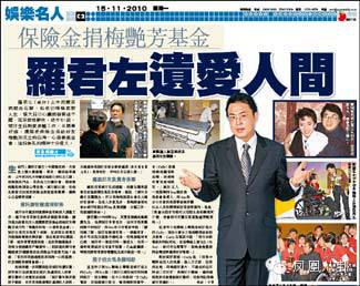 罗君左的突然去世,没有留下太多遗嘱,遗愿之一就是将保险金捐给梅艳芳基金,帮助更多的人。