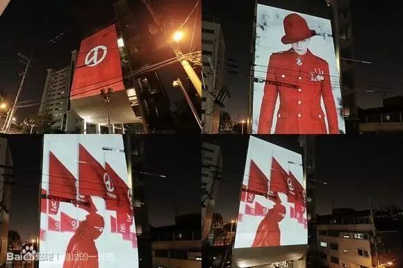 这次Media Facade可以看到G-Dragon 2辑“COUP D’ETAT”红色和黑色的大型照片传达强烈印象。