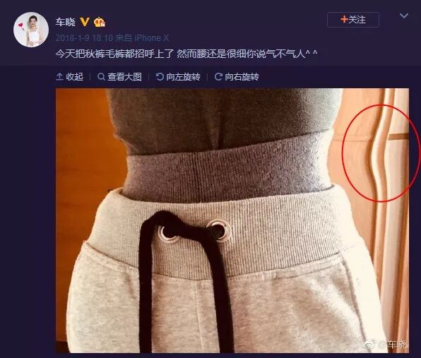 车晓在微博晒出过自己穿了两条秋裤的照片,还故意p照片自黑,自称穿两条秋裤腰依然很细,简直就是一股泥石流。