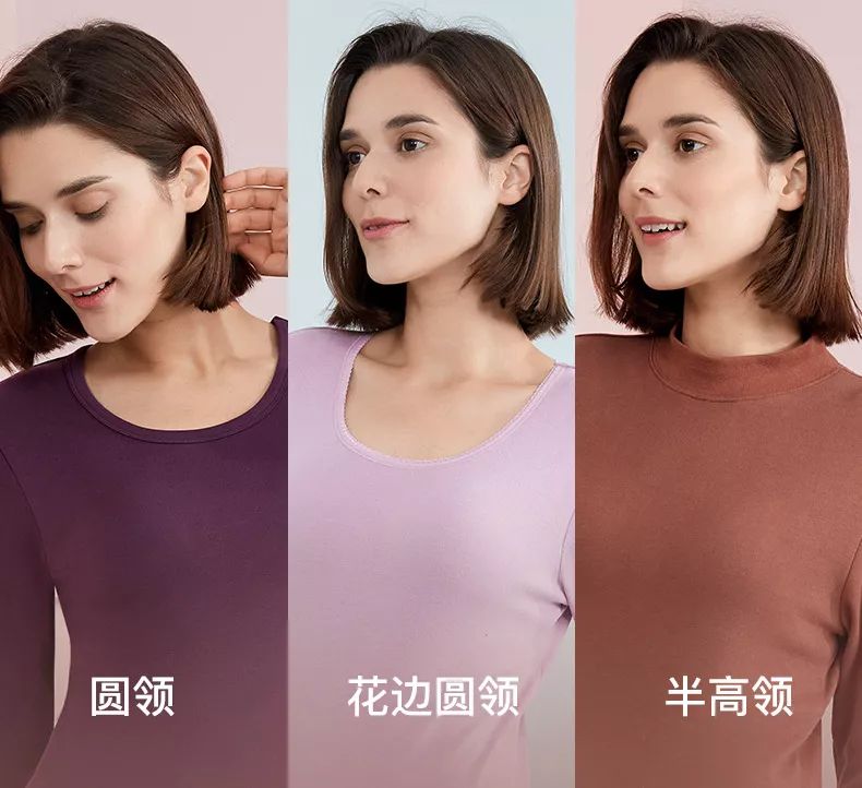 女款共有三种领型选择,简约的圆领,性感的花边圆领,保暖亲肤的半高领。