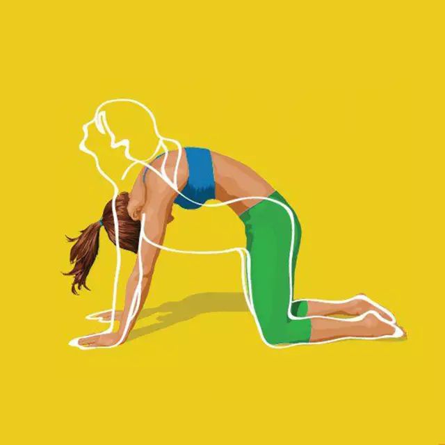 1.跪姿,手臂和大腿与地面垂直,背部、面部、颈部与地面平行。2.吸气,慢慢抬头,尾骨向上拉起,小腹向地面的方向压。