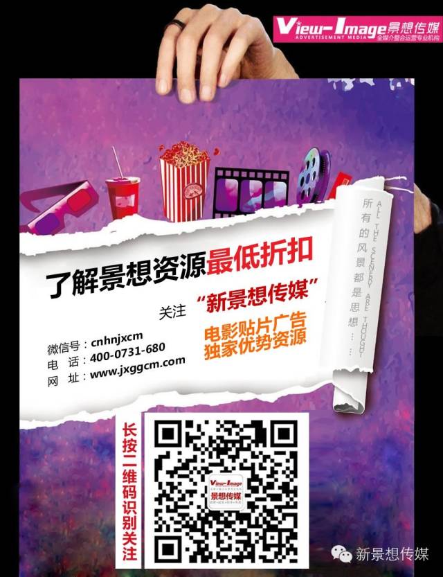 电影贴片独家资源整合机构--新景想传媒,又名湖南景想传媒有限公司。是湖南省颇具影响力的多媒介整合运营服务商,拥有专业的品牌整合能力和丰富的媒体资源,为客户实现广告投资效益最大化,助客户品牌传播瞬间发力,加速推广。公司旗下拥有九大核心广告资源。尊享热线:4000731680