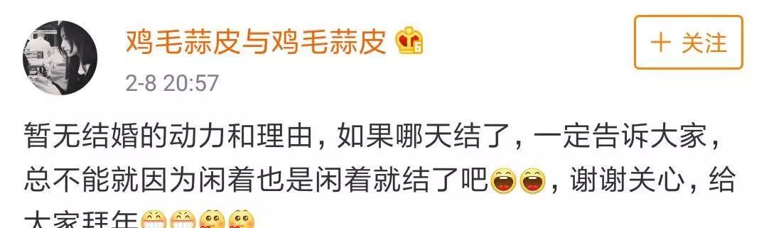 明星们对待恋爱和结婚、生孩子等私人事情一直是比较谨慎的,经常会选择隐瞒。但这些也是普通人所追逐的、猜测的,一不小心就会酿成很多的误会。在2月4日,徐静蕾发了一条新年祝福的微博,朋友刘春泉的下面留言说祝爱豆新婚快乐,造成了一个误会,让人以为徐静蕾和黄立行已经结婚了。2月8日,徐静蕾对这个传闻进行回应,称:结婚又不丢人,瞒着干嘛?