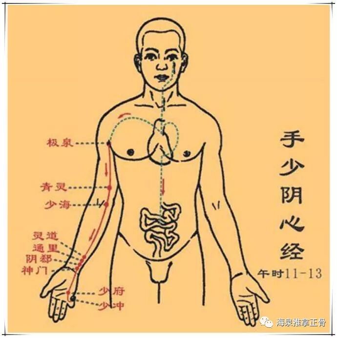 手少阴心经穴指手少阴心经所有的腧穴,即所有经穴。分布在腋下,上肢掌侧面的尺侧缘和小指的桡侧端。起于极泉,止于少冲。左右各9穴,分别为极泉、青灵、少海、灵道、通里、阴郄、神门、少府、少冲。