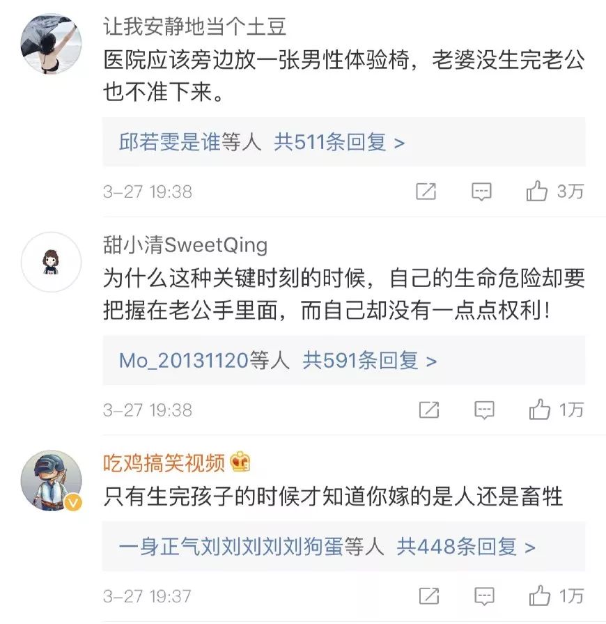 也难怪熊黛林会放下明星的架子,如此仗义执言了,相信谁看到这条新闻都会觉得不可理喻,原新闻下面热评第一条说“医院应该旁边放一张男性体验椅,老婆没生完老公也不准下来”,这条评论的点赞达到了3万。还有网友质疑“为什么这种关键时刻,自己的生命却要把握在老公手里面,而自己却没有一点权力”?