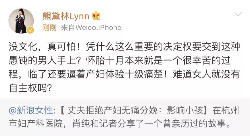 作为一个即将临产的孕妇,相信熊黛林对此的感受比普通人更强烈吧,而且无比赞同她说的“没文化、真可怕”,现如今无痛分娩已经被普及,可还有人认为麻醉会影响孩子,所以不管妻子有多痛,也不允许用麻药,这不是“没文化”是什么?