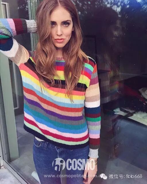 时尚博主Chiara Ferragni也不甘示弱,彩色条纹衫卖萌走起~