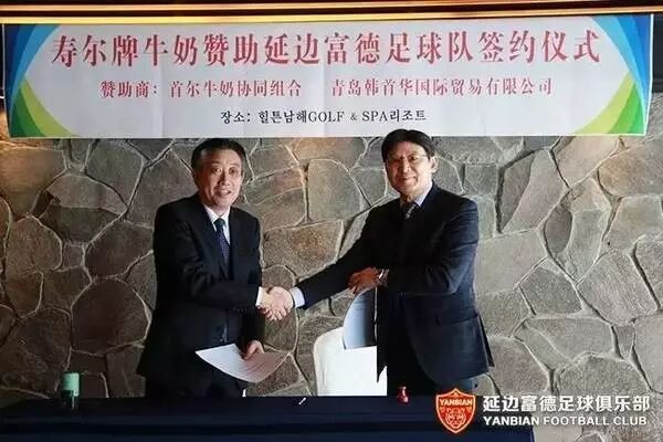 北京时间2月10日下午14点,在延边富德足球队釜山冬训所驻酒店的会议厅内,延边富德足球俱乐部总经理于长龙与青岛韩首华国际贸易有限公司总经理李景玩就寿尔牌牛奶赞助延边富德足球队项目达成协议,寿尔牛奶正式成为延边富德足球队的特供牛奶品牌。