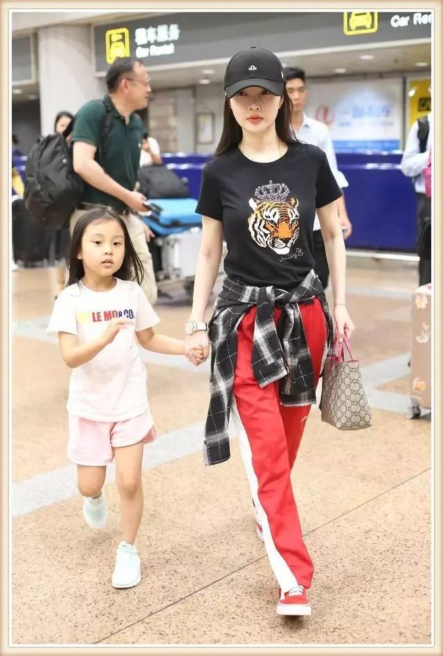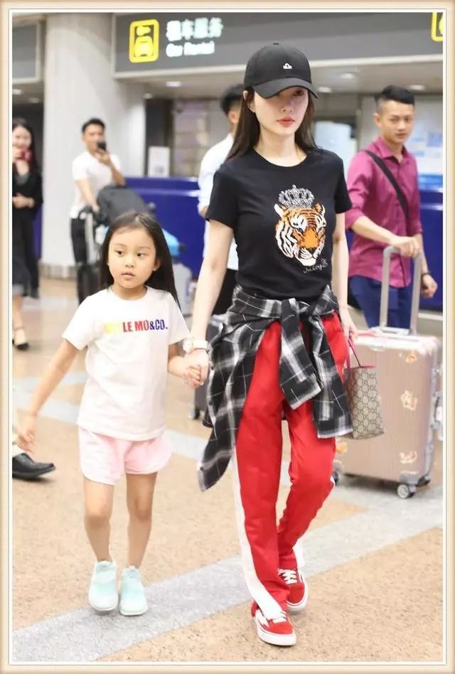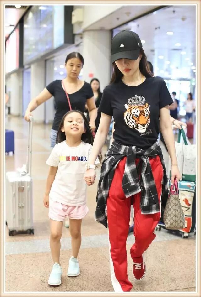而李小璐则是黑色T恤配红色运动裤以及红色帆布鞋,腰上还系了件黑白格子衬衫,一身搭配说不出的青春减龄,牵着小甜馨一点都不像母女俩,反倒像两姐妹呢!