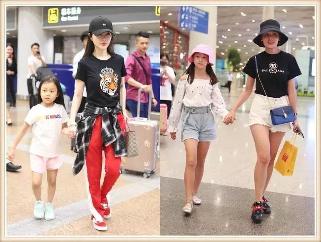 森碟和叶一茜虽然没有穿亲子装,但是从头到脚的搭配都是相呼应的,都是戴着渔夫帽,上衣配短裤,大秀长腿。母女俩都是美人胚子,十分养眼。