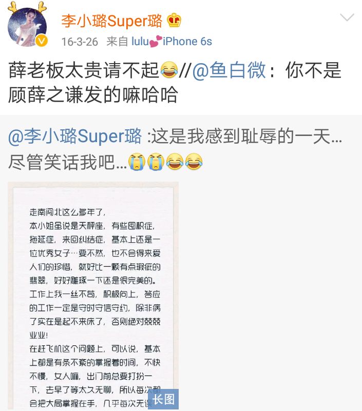 就说说被捧上天的上司,被捧在手心里的小公举,竟然受到被删的遭遇,我想李小璐一定很气。