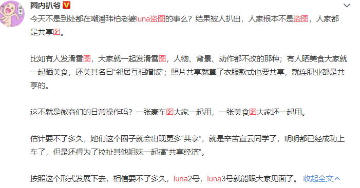 绝了!潘玮柏是被她PUA了吧? 深夜娱乐圈 港台男星 2020-08-03 17:31:57 1423 创作不易,用心坚持,欢迎请BaGua喝几杯爱心咖啡!打赏并支持本文 打赏并删除本文 深夜娱乐圈激情总在后半夜,八卦深夜更有料~ 老实说,我真的没想到,潘玮柏结个婚能牵扯出这么多事,瓜吃出连续剧效果,也是没谁了。冷不丁从官宣婚讯,网友们一边喊着“爷青结”,一边毫不手软地扒出原来他们的爱情是从py转正开始。(传送门:爷青结!潘玮柏结婚了!)行吧,但浪子回头金不换,也算是happy ending。结果,王思聪突然下场吃瓜,掉了一地瓜皮。py转正史又变成ww女的进击。网友们再度顺藤摸瓜还摸出了郭天王嫂这条故事线,以及Amy姐这位神秘的幕后高手。(传送门:py刚转正,就被王思聪扒了?)很快,潘玮柏团队下场发布了律师声明。但,你以为这就完了?No。又一个新华点被发现了。关于潘嫂的人设,以及疑似Amy姐所打造的“美女产业链”。前一阵有网友发现,潘嫂的微博里很多岁月静好的图文内容竟然跟很多网红一模一样。这是潘嫂做的菜↓这是另一位网红做的菜↓从菜式到摆盘,就连拍照角度都一模一样。怎么说呢?这三盘菜就算能分裂生殖都不一定能生出跟自己这么像的三盘菜。虽然当事人回应两家是邻居,互相蹭饭。潘嫂还风淡云轻地第一时间点了赞作为回应。但两人发布时期前后隔了一个月,看文案都说是今日厨房(艺),这具体到底是出自谁的手就说不清了。不仅于此,其他的巧合就更像是鬼打墙了。比如这张,同一个阳台↓这是潘嫂的图。 这是其他网红的图。一个露腰一个露腿,这同款的大袄子我都怀疑是不是批发的。 又如这张放生↓这是潘嫂。 这是其他网红。同一个地点同一个角度,就连红色塑料桶都是一样的。 还有这个↓同一张沙发、同一个包包,流水的网红拍照。同样的景点、同样的浴缸、同样的玫瑰花瓣。以及这个↓这个↓这个↓这个↓ 有时候连文案都是如出一辙的岁月静好,强调善良。当然了,最魔性的还得是滑雪图。全身上下包得严严实实,也认不出谁是谁,一张图永流传。这么顺下来,说盗图确实是冤枉人了。严格来说,这叫共享。本质上跟在某宝上花几块钱买优质图文来发朋友圈发微博差不多,都是为了包装自己,营销人设。只不过后者是为了满足虚荣心,而前者侧重在个人。再结合潘嫂其他被扒细节。整过容↓(来源:凤凰娱乐)流水化批量生产图文内容,营造上得厅堂下得厨房的白富美好嫁风人设↓Amy姐带着参加大大小小的宴会↓py转正,公开恋情↓一条流水线下来,思路清晰,真的可以说是步步为营。再复盘一下方媛的天王嫂上位之路,大差不差也基本是这个方向。值得一提的是,潘玮柏和郭富城官宣时都特意圈出了女方的微博,这就很微妙了。娱乐圈里,除非是明星跟明星,恋爱结婚根本藏不住,与其等着被扒被拍,不如大大方方官宣,这样更容易拉好感。至于明星跟素人的恋情,不管是出于对感情的保护,还是对个人隐私的保护,大都能有多低调就有多低调。Luna和方媛,虽然说是网红,但在成为天王嫂之前,在公共话题里完全是查无此人,说是素人确实没毛病。官宣恋情圈名字这一操作,除了让自己站在风口浪尖,接受来自四面八方黑历史的投递以外,对恋情的保护完全不起任何作用。只有一点,方便Amy姐“招生”。嫁给郭富城的方媛,和嫁给潘玮柏的Luna就像是两块活招牌。招牌打响了,此后“天王嫂训练营”根本不缺生源。还记得潘玮柏官宣婚讯时王思聪说了什么吧?其实当年郭富城车内牵手官宣跟方媛的恋情时,王思聪也暗戳戳地内涵过。照这个现状看,要不了多久,luna2号,luna3号就能跟大家见面了。不过,潘玮柏到底是不是被美女训练营的冤大头暂时不能下结论,万一俩人真是真爱,确实白头到老了呢?但他PUA“无尾熊”cp粉,割韭菜算是实锤了。在有女朋友的情况下参加恋爱综艺就不说了,在节目结束后依然捆绑cp。空降粉丝群催数据。团队私联cp粉丝后援会配合新专辑预售,结果就是,粉丝为潘玮柏买CD、团演唱会门票、单人应援总共超过200万元。在恋爱期间,吃尽cp粉的红利。要不是如今潘玮柏官宣婚讯,cp粉这韭菜估计还有得割。但人可负我,因果不负。潘玮柏现在就像走了cp粉的老路。cp粉是磕着被营销的假情侣,潘玮柏是喜欢这被流水化打造过的假美人。cp粉现在是大梦初醒了,潘玮柏不知道能不能醒。上周由于设置问题,好多粉丝反馈加不上微信,现在已经恢复了,快来扫码领福利啦~责任编辑:砖砖商务合作QQ:2777140739往期推荐“营销咖”说自己不想红?如果不是“好妈妈”,她早就糊了?救命,王晶又来恶心人了!py刚转正,就被王思聪扒了?爷青结!潘玮柏结婚了!深夜睡不着就来撩深夜君吧! 创作不易,用心坚持,欢迎请BaGua喝几杯爱心咖啡!打赏并支持本文 打赏并删除本文 感谢您的支持鼓励,我会继续努力的!文章地址:用户邮箱:打赏金额:USDT 请输入数字点击”去打赏“,即可进行打赏支持本文章哦 潘玮柏 About the Author 深夜娱乐圈 功能介绍:激情总在后半夜,八卦深夜更有料,小三上位潜规则,明星私密大曝光,深夜君等你来翻牌哦~ Related Posts 反转!华晨宇七年女友又出重锤了? 2021-07-26 17:30:21 据说这是罗志祥最喜欢的运动! 2021-05-04 17:30:40 她要把李菲儿踩到什么程度才肯罢休? 2021-01-07 15:45:53 罗志祥,彻底没戏了 2020-08-03 17:31:57 绝了!潘玮柏是被她PUA了吧? 2020-08-03 17:31:57 发表评论