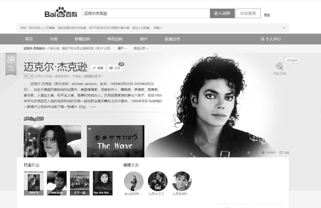 百度百科上搜索迈克尔·杰克逊,除了鼠标很难拖到底的生平事迹外,还有界面黑白灰的色调,让人看了不禁黯然神伤。
