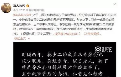 《花少3》首播那天,宁静发微博说:“集体生活就是拼演技 多少而已。”配图是花,被认为是在讲《花少》了。