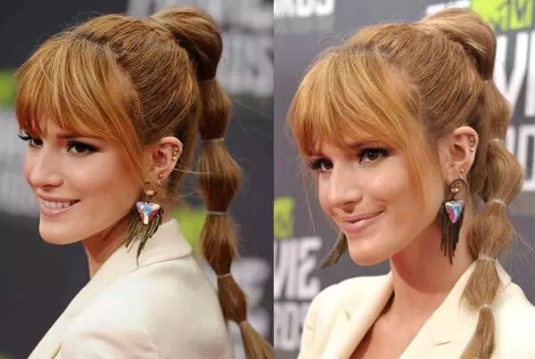 而贝拉·索恩的马尾部分小鼓包没有那么圆润,但是配上空气刘海更显可爱。