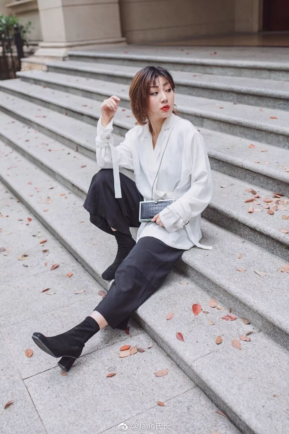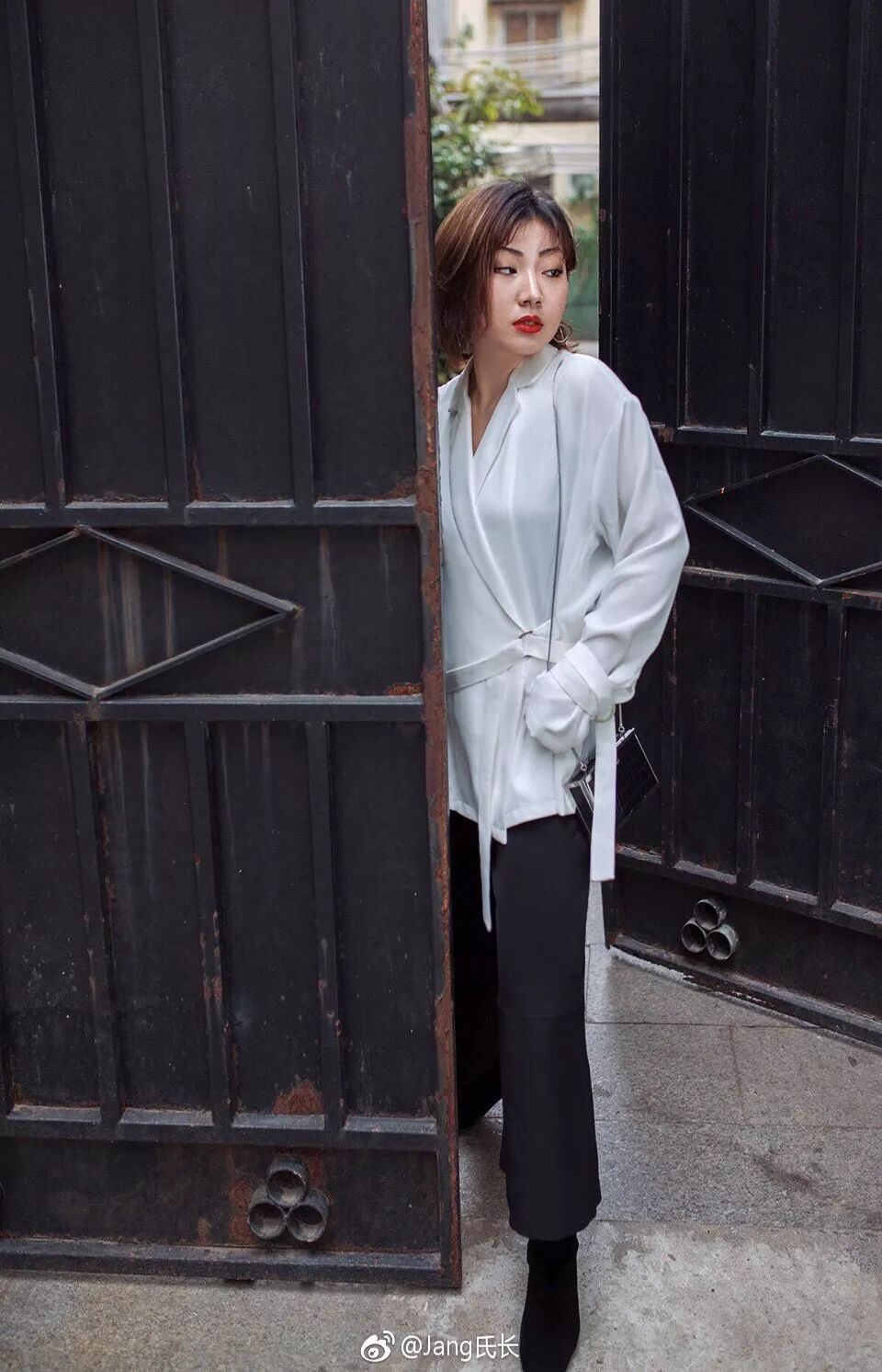 最近不少时髦精都瞄上了Amii,譬如这位。她用Amii飘带西装搭配7分的喇叭裤和袜靴,搭配不繁复,但挺有看头。