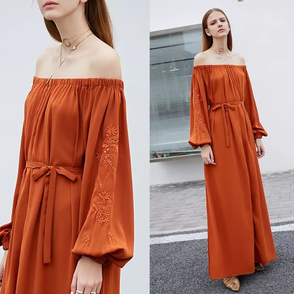 正值春天,满世界都是罗曼蒂克的因子,一条浪漫的长裙最适合撩拨少女心了。一字灯笼袖设计和腰带设计,轻松做到显瘦又遮肉。配以花鸟绣花,更添灵秀之韵。
