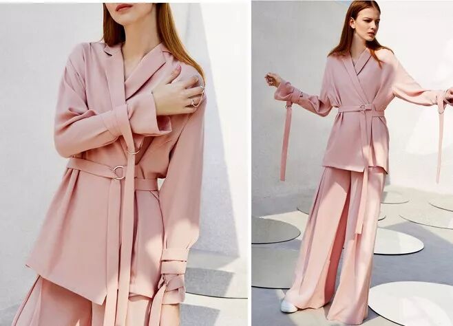 西装光洁丝滑的面料,柔软的廓形感,充满明确的高级感。上衣和裤子两者的质感反差,很值细看。