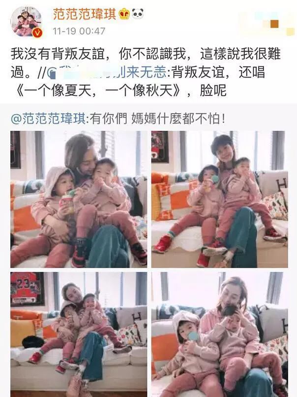 2018年2月份,范玮琪回击网络暴力,po出自己与孩子的照片,配文:“有你们,妈妈什么都不怕。”
