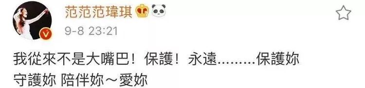 果然,范玮琪可能会迟到,但从不缺席。9月8日晚,范玮琪发文称:“我从来不是大嘴巴!保护!永远.........保护你,守护你,陪伴你~爱你””