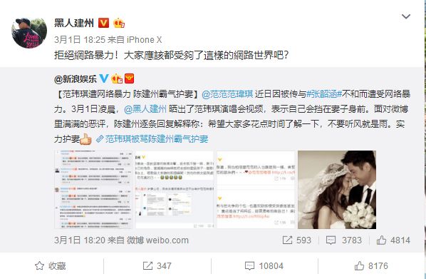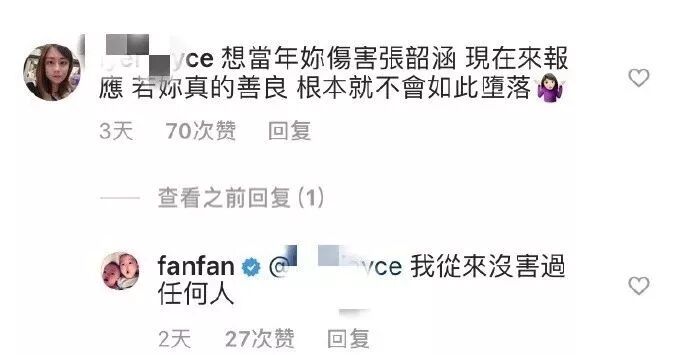 范玮琪受到了非常多的差评,黑人跳出来护妻,回复网友:“从来没有骂过张韶涵。”