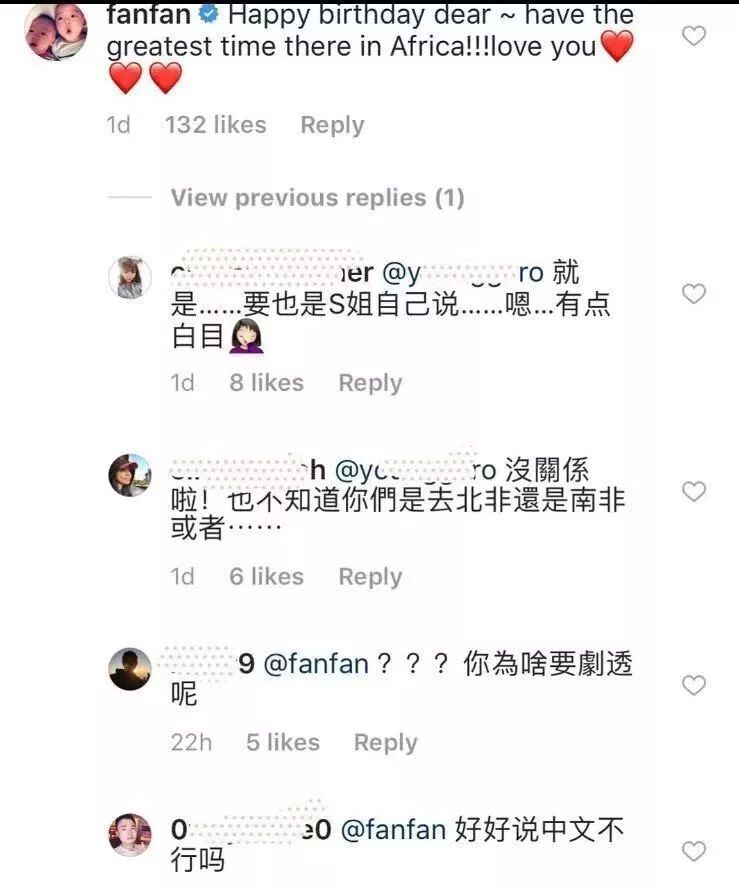 结果,范玮琪跑到小S社交账号留言:“...have the greatest time there in Africa!!..笔芯”....