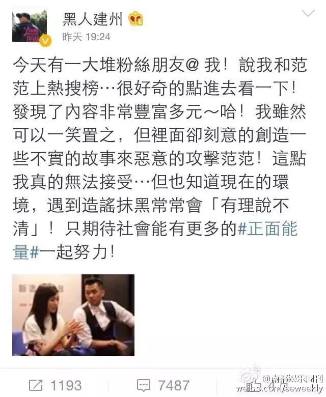 黑人又在微博上霸气护妻,逐条回复网友的微博:“我太太很善良,从来不恶言相向,这是我最爱她的原因之一!希望大家多了解一下,不要听风就是雨。”