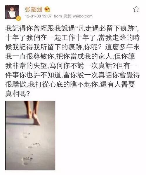 后来,张韶涵在微博回应过助理背叛的事情,称自己一直把阿伟当家人,阿伟令她非常失望,为何不说一句真话。